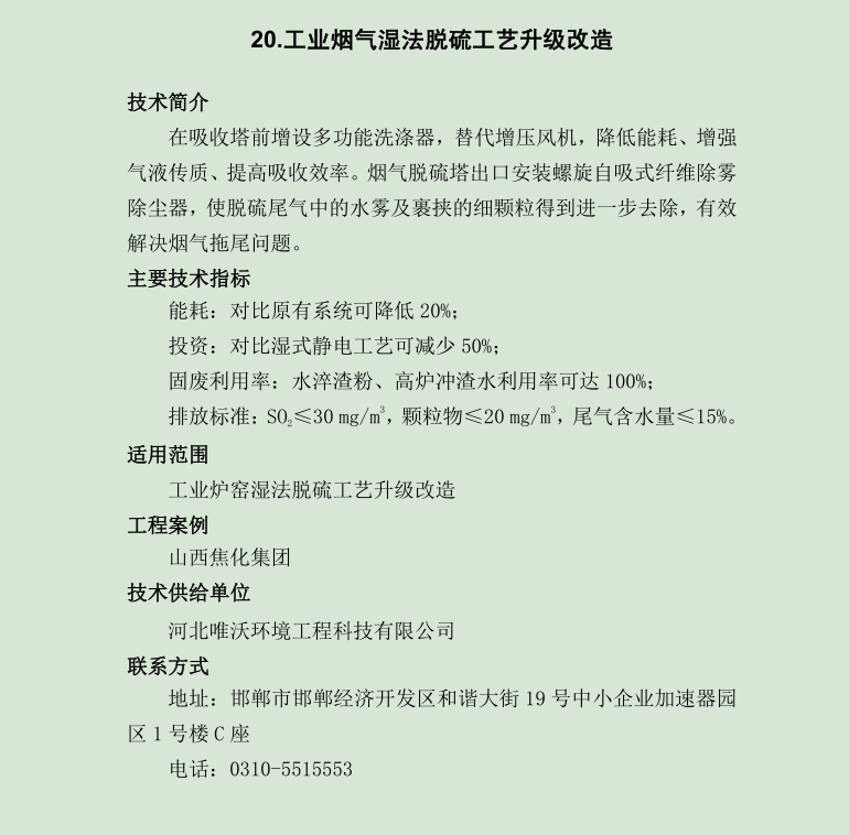 指導(dǎo)目錄中,唯沃入選的技術(shù)是“工業(yè)煙氣濕法脫硫工藝升級改造”,主要適用于工業(yè)爐窖濕法脫硫工藝升級改造,比原有系統(tǒng)降低20%的能耗,并且水淬渣粉、高爐沖渣水利用率可達(dá)100%,是科技治霾、精確治污的重要標(biāo)志性技術(shù)之一。